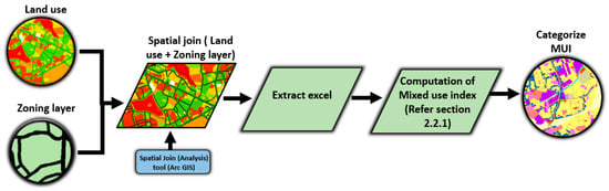 In the land-use data preparation, a polygon-based land-use data set was utilized to compute the mixed-use index for the respective zones. Hence, the study joined the land-use layer with the zone-layer, which was developed in the above-mentioned step (refer Figure 4). Then, the study computed the mixed-use index for each zone, based on the index introduced by Frank et al. [] (refer Equation (6)). Figure 5 indicates the process of preparing the land use mix.