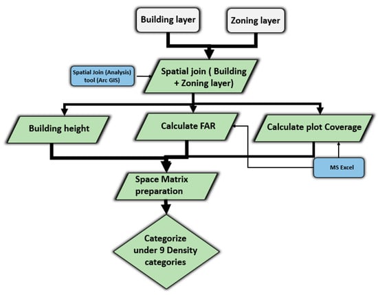 This study followed the space matrix method (refer Figure 3) to prepare the density data set. First, spatially joined the zone-layer and building layer. Then, computed the plot coverage and floor area ratio of the respective zones, utilizing the Equations (8) and (9), respectively. Next, categorized the zones as per the 9 density categories (refer Table 3) introduced in space matrix. Those categories have been coded as follows. Figure 6 indicates the process of preparing the density data set.