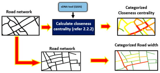 Both mobility and topological characters were computed during the accessibility data preparation. The study computed the CC of each road-segment, utilizing the sDNA tool [] in QGIS environment. The study utilized “road centerlines”, i.e., the center of the right-of-way on the given road segment, for preparing the road-segments graph. In the road-segments graph, segments represent the locations of trip productions. Then, the study joined the CC road segments with analyzed zones and the prepared data set including the average CC of each zone. Road width represents mobility character of accessibility. The study computed and prepared a data set, which included the average road width of each zone. Figure 7 depicts the process of preparing the accessibility data set.