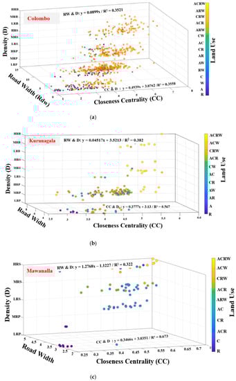 The study utilized the 4D plot graphs to represent the 4-dimensional relationship among density, land use, closeness centrality, and road width. Following figures display the 4D plot graphs of the three case study areas (Figure 10a–c). The results clearly depict the relationship between density and accessibility. As an example, in the Colombo case study (refer Figure 10a), high-density areas (i.e., block type density categories such as HRB, MRB, and LRB) recorded a high level of accessibility in terms of closeness centrality values (i.e., CC > 6) and road width (i.e., width > 10 m). Further, low-density zones (i.e., LRP, MRP, and HRP) recorded a low closeness centrality (i.e., CC < 3) and narrow road width (i.e., width < 5 m). The result indicates that high accessibility in terms of topological and roadway characteristics has a strong relationship with high-density zones. Furthermore, high-density zones (i.e., block type density categories such as HRB, MRB and LRB) predominately recorded in highly mixed land-use environments (i.e., ACRW, ARW, CRW, ACR, and ARW), while low-density zones (i.e., LRP, MRP, and HRP) predominately recorded in less mixed land-use zones (i.e., R, C, A, and W) and a low level of accessibility. Similar patterns can be observed in both Kurunegala and Mawanella case study areas. Therefore, these results confirm the argument made by the study—that is density, land use, and accessibility variables have a three-dimensional relationship. Furthermore, the results indicate that density of a given area is dependent on land use and accessibility as indicated in Equation (5) (i.e., (D = f(A) * (LU)).