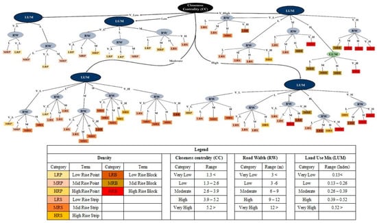 The study utilized the decision tree analysis to read patterns of a given data set. The output of the analysis generates a tree type flow diagram to explain the patterns of the data set and Figure 11 depicts the summary of the decision tree analysis results in the three urban areas. The results of the decision tree produce a logical explanation as to how density categories are materialized under different land use and accessibility levels in the selected case study areas. All three case study areas recorded a high level of decision tree model accuracy (i.e., accuracy ~ 80%) (refer Table 4). The results indicate that the decision about the density is first made based on closeness centrality, then followed by land-use mix and road width. Accordingly, it indicates that high-density zones with a high level of accessibility (both in terms of topological and roadway characteristics) have a high land-use mix. These results further confirm the argument put forwarded by the study. First, the influence of accessibility in terms of both topological and roadway characteristics must be considered. Secondly, the density of a given area depends on land use and accessibility as indicated in Equation (5) (i.e., (D = f(A) * (LU)).