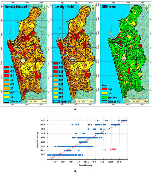 Density regression model result in Colombo: (a) spatial distribution of model and actual density categories and (b) relationship between actual values and model values.