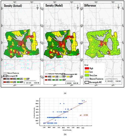 The proposed model has recorded an accuracy of 72% (i.e., R2 > 0.72) in the Kurunegala case study area, and out of 148 zones, more than 81% recorded a very low level of error (Low error = 10% difference). Figure 13a depicts the spatial distribution of actual density, modeled density, and error, and Figure 13b depicts the relationship between actual values and modeled values in a line plot.