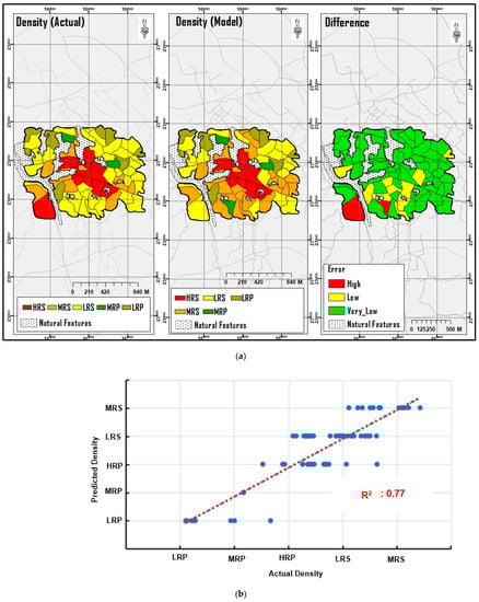 The proposed model achieved around 77% (i.e., R2 > 0.77) accuracy in the Mawanella case study area and out of 148 zones, more than 80% recorded a very low level of error (low error = 10% difference). Figure 14a depicts the spatial distribution of actual density, modeled density, and error, and Figure 14b depicts the relationship between actual values and modeled values in a line plot.