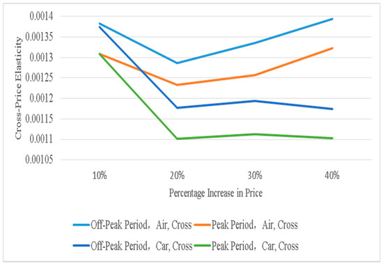 Figure 2 shows that overall, the cross-price elasticities of demand for train and air, and train and car, during off-peak period are bigger than the ones during peak period, respectively, which may be because during peak period, traffic flow is larger, and travelers have fewer chances to choose other travel modes. When the train fare increases from 10% to 20%, the cross-price elasticities of demand for train and air, and train and car, during peak period and off-peak period decrease. When the fare increases from 20% to 40%, the cross-price elasticities of demand for train and air during peak period and off-peak period show a rising trend, and the cross-price elasticities of demand for train and car during peak period and off-peak period show a trend of a slight increase and then a slight decrease.