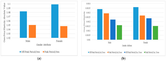 The variation rules of the own- and cross-price elasticities of demand with the change in traveler’s gender attribute: (a) own-price elasticities of demand; (b) cross-price elasticities of demand.