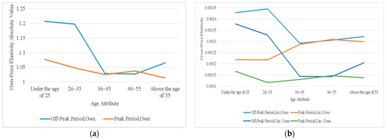 The variation rules of the own and cross-price elasticities of demand with the change in traveler’s age attribute. (a) own-price elasticities of demand; (b) cross-price elasticities of demand.