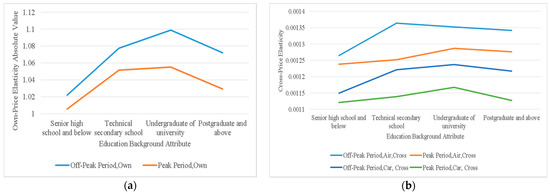 The variation rules of the own- and cross-price elasticities of demand with the change in traveler’s education background attribute: (a) own-price elasticities of demand; (b) cross-price elasticities of demand.