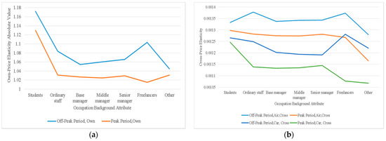 The variation rules of the own- and cross-price elasticities of demand with the change in traveler’s occupation background attribute: (a) own-price elasticities of demand; (b) cross-price elasticities of demand.