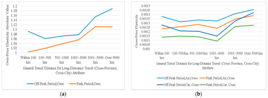 The variation rules of the own- and cross-price elasticities of demand with the change in traveler’s general travel distance for long-distance travel (cross-province, cross-city) attributes: (a) own-price elasticities of demand; (b) cross-price elasticities of demand.