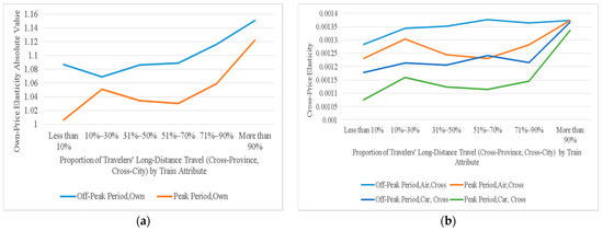 The variation rules of the own- and cross-price elasticities of demand with the change in proportion of travelers’ long-distance travel (cross-province, cross-city) by train attribute: (a) own-price elasticities of demand; (b) cross-price elasticities of demand.