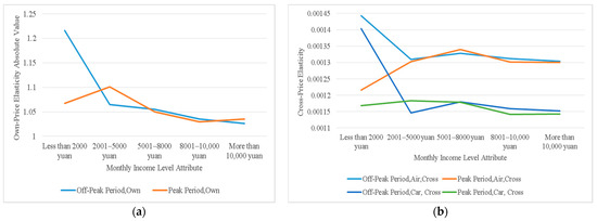 The variation rules of the own- and cross-price elasticities of demand with the change in traveler’s monthly income level attribute: (a) own-price elasticities of demand; (b) cross-price elasticities of demand.