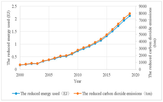 EJ is the energy unit and 1 EJ is equal to 1 × 1013 joule, and and are accurate to one passenger and one ton, respectively. are accurate to three decimal places and other variations are accurate to two decimal places when there are more than two decimal places. Table 2 shows that when the train fare reduces by 10% in China, the number of travelers switching from planes to trains is about 7823 passengers in 2000, and then increases to 77,059 passengers in 2019, and the average travel distance of travelers switching from planes to trains is from 1176 to 1454 km, which is about the distance between Beijing and Shanghai. The reduced energy used and CO2 emissions are shown by Figure 11.