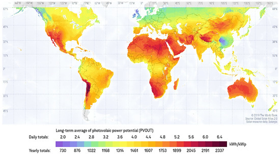 The above objective can be achieved by developing energy systems aimed at reducing the greenhouse effect, in which weather-dependent renewable energy sources (VREs) also play an increasing role. Thanks to the rapidly evolving technology, more and more solutions that use solar energy as an alternative energy source with ever-increasing efficiency are being developed [5]. A significant proportion of the world’s population lives in cities, so it is an important result that many cities around the world have launched their own solar energy programs for the purpose of protecting the environment and promoting sustainable development. Solar energy is gaining ground, on the one hand, because it is essential for many processes in nature, and on the other hand, because it is a clean, abundant, sustainable, and—most importantly—universally available resource [6,7,8,9,10,11,12,13,14]. What is more, the amount of solar energy reaching the surface of our planet is thousands of times greater than the current energy need of the population [15,16,17]. Thanks to all this, recently, an expansion of solar systems (photovoltaic (PV)) can be observed: Their total capacity worldwide was already about 627 GW by the end of 2019, which played a key role in the global efforts for sustainability, green growth, and a higher share of low-carbon economy. Over the last decade, the support schemes (e.g., the Feed-in-Tariff system), on the one hand, and a decline in initial capital expenditures due to the boom in innovation and technology, on the other hand, have had a positive impact on the spread of solar systems [18]. Examining the map of the global annual PV power generation potential, it can be concluded that the annual amount of PV energy that can be produced varies, on average, between 700 and 2400 kWh/kWp by geographical location (Figure 1). In the case of Hungary, values vary between 1050 and 1250 kWh/kWp (Figure 1) [19].