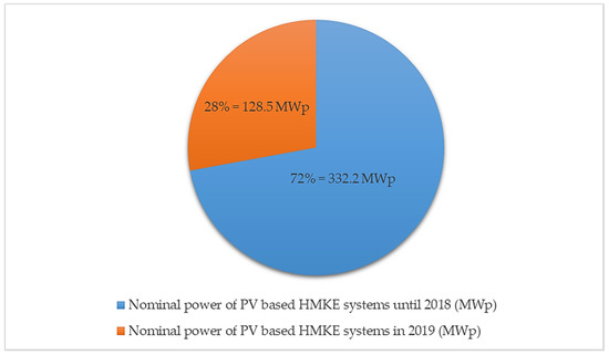 The total installed photovoltaic (PV) power of the Hungarian household-sized photovoltaic power plant (HMKE) systems [27].