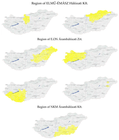 The photovoltaic HMKE database was created based on the 2019 data of three Hungarian electricity suppliers (ELMŰ-ÉMÁSZ, EON, and NKM). In 2019, the regions of the electricity suppliers were redesigned; the database used herein already corresponds to the new division, which is illustrated in Figure 3. Experience shows that in the case of territorial indicators, there is no significant change from one year to the next, unless there is a significant economic or social crisis. Between 2018 and 2019, the aforementioned change did not occur, which allowed the use of the latest (2018) data in the case of the district indicators in the studies and their comparison with the latest 2019 HMKE data.