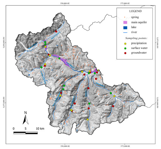 This study was conducted by performing five monthly sampling campaigns from August to December of 2019. More specifically, 170 water samples were collected (64 surface water samples from 7 streams, 69 groundwater samples from 15 springs, 34 rain samples from 10 sites and 3 snow samples; Figure 2, Table 6).