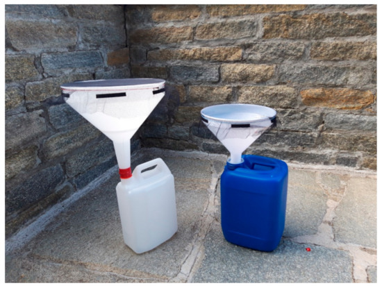 The collection of rain samples required the previous installation of rain collectors. For each rainwater sampling site, a water collector for chemical analyses and another one for isotopic analyses, manufactured using International Atomic Energy Agency (IAEA) guidelines [38], were installed. In the water collector for isotopic analyses, a film of paraffin oil was added to significantly reduce evaporation, which would distort the isotopic results (Figure 3). In the November campaign, three snow samples were collected by manually filling sampling bottles with snow and subsequently letting it melt.