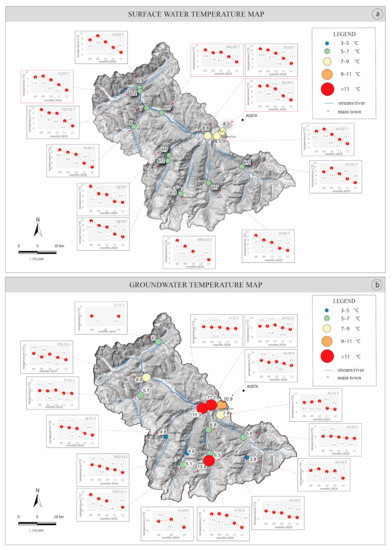 Temperature maps of (a) surface water and (b) groundwater.