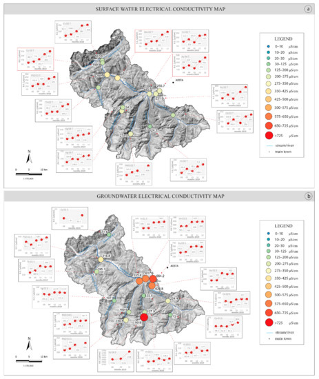 Electrical conductivity (EC) maps of (a) surface water and (b) groundwater.