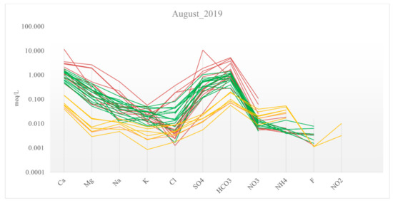 Schoeller diagram of waters sampled in August 2019. Green lines represent surface water, red lines represent groundwater and orange lines represent precipitation.