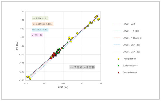 Isotopic studies on the Aosta Valley area are few, fragmented and outdated. In [32,33], the authors obtained the equation for the regional local meteoric water line. The local meteoric water line, formulated in 1995, was calibrated by using isotopic data for surface water only, whereas the line proposed in 2002 was calibrated using groundwater data only (Table 4).