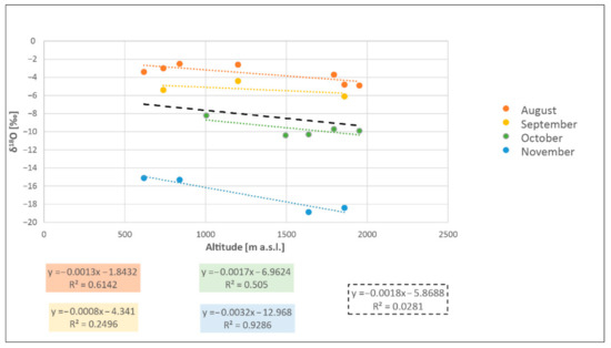 Precipitation δ18O values versus the altitude of the sampling location. The linear regression of the data series (dashed black line) allowed us to obtain an overall vertical isotopic gradient for the studied area. The coloured dashed lines represent linear regressions for August (red), September (yellow), October (green) and November (blue). Equations of the linear regression and R2 were reported for the single months and for the entire period.