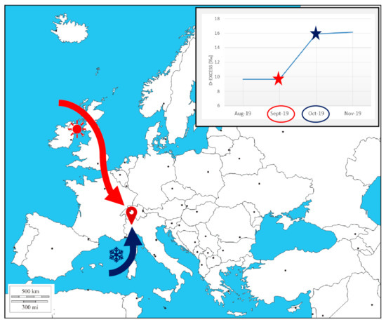 The deuterium excess values of precipitation increased as the cold season approached, particularly in the months of September and October. By analysing the deuterium excess values of precipitation, as was done by previous authors [32], it was possible to highlight that, in the warm season until September, precipitation formed from clouds coming from the Atlantic Ocean (with values up to 15‰ [50]). In the late autumn (i.e., October for the study area), the main contribution to cloud formation was the Mediterranean Sea (with higher values up to 22‰ [51]). In conclusion, the western Aosta Valley is located in an area with influences from two seas and is therefore susceptible to both qualitative and quantitative changes in the two different meteoric inputs, as was already proven for most of the Alpine area (Figure 13).