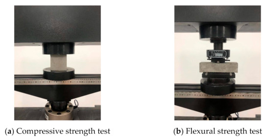 In this test, the size of the specimen was 40 mm × 40 mm × 160 mm, and the test device was a pressure testing machine with measuring range of 300 kN, as shown in Figure 2b. The flexural test was carried out continuously at the loading speed of 0.01 mm/min until the test block was broken. The load and position at the time of damage were recorded through the test. The flexural strength is calculated as below: