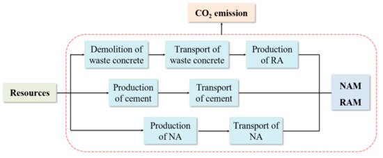 In the actual calculation process, it is difficult to get the accurate data of aggregate and cement production enterprises or data in actual transportation process. Therefore, the carbon emission coefficient method was used to estimate and compare the carbon emission of recycled aggregate and natural aggregate in the process of production, transportation and usage. The carbon emission of the material can be obtained by multiplying the consumption or output in the production, transportation and mixing ratio of NAM and RAM in Figure 3 by the corresponding unit carbon emission coefficient, as shown in Formula (3) [18,19,20].