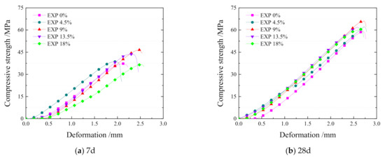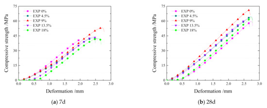 When the proportion of EXP increases, the compressive strength rises, reaches the peak at 9%, and decreases with a relatively big value. It seems that the EXP enhances the early age compressive strength and the max deformation range, which means that the mortar possesses much higher crack resistance. As a result, there is less possibility for cracks to emerge in the early stage [24,25].