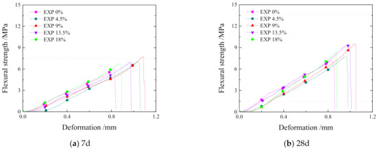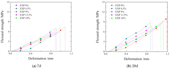 The original data of flexural strength test has been simplified and present in Figure 6 and Figure 7. Figure 6 depicts the flexural strength of NAM. The changing trend of flexural strength is similar to compressive strength of NAM. The flexural strength first increases, then decreases when the proportion of EXP reaches 13.5%. The max 7d flexural strength is almost 7.6 MPa, while the 28d flexural strength is about 9.2 MPa at the EXP content of 9% and 13.5%. However, the deformation is quite different as to 7d flexural strength. When the proportion is around 9%, the ultimate deformation is the biggest, which means that the EXP increase the crack resistance of specimens and the plasticity is improved from specimens of 0% EXP [26,27].