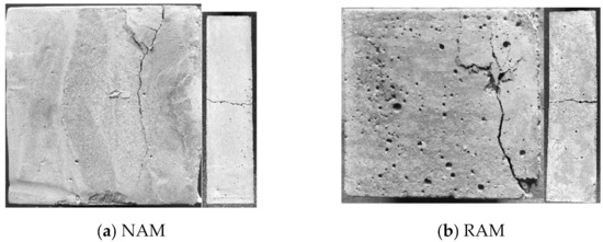 Pictures of some specimens after the test are collected, as shown in Figure 8. The development of cracks in compressive strength specimens starts from one third of one side of the specimen. The bubbles on the surface of NAM specimens are obviously less than those of RAM specimens, which is related to the particle size and fineness modulus of RAM. Also, the RAM absorbs more water than NAM and reduces the mixing water, which generates more porosity in the samples. The failure modes of the bending specimens are consistent, and all fracture from the middle of the specimens. The addition of EXP limits the initial volume expansion of cement water and compensates the volume shrinkage during curing and cooling. It can be seen from the above results that EXP has more obvious compensation shrinkage mechanism in NAM specimens. At the end of the curing period, the strength enhancement plays an important role. For RAM, the effect of EXP is limited to the secondary utilization of aggregate, so the effect is not so obvious [30,31].
