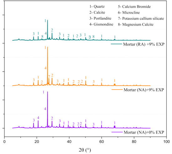 Figure 9 shows the XRD chemical composition pattern of NAM with 0% EXP and 9% EXP, and of RAM with 9% EXP. The strength of mortar and concrete is mainly from quartz. The quartz content of RAM is less than NAM, which is the main reason why the strength of RAM is lower than that of NAM. Due to the utilization of CDW, the components of RAM are more complex, as shown in Figure 9.