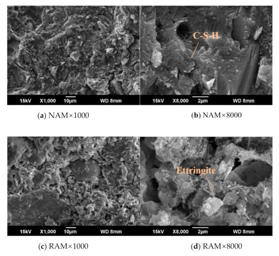 Compared with SEM images of NAM, the microstructure of RAM is loose, as shown in Figure 10. The hydration products contain more C-S-H in NAM and ettringite (needle shape), and less large crystals. At the same time, a large number of calcium hydroxide crystals overlap each other. This is consistent with RAM having lower strength and NAM having better performance.