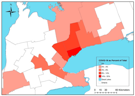 COVID-19 cases as a percentage of the total number of cases in southern Ontario.
