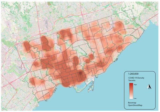 Toronto’s economic growth has been at the forefront of North American economic growth. Its retail and commercial sectors have grown markedly in the last decade due to economic prosperity and demographic changes. The region has a diversified ethnic and cultural legacy. This cultural diversity has given rise to new economic opportunities, contributing to the municipal prosperity and the ongoing growth of commercial activity in the Greater Toronto Area. Still, there is growing concern as commercial activity has been put on hold since the end of March 2020. Furthermore, as a consequence of this growth, the region has suffered significant urban sprawl [18]. There is a growing risk of pollution as population density increases in the neighboring areas within the perimeter of the city of Toronto. Although this sprawl is still far from reaching Ontario’s greenbelt, it must be considered and monitored by decision-makers and stakeholders. With rapid urbanization and the significant growth of real estate prices in the last decade, the city of Toronto shows a stark amount of economic heterogeneity. It is where geographical clusters of poverty are evident in some neighborhoods throughout the city. The asymmetry between wealth and poverty throughout the city has led to escalating issues that directly affect health, planning, social justice, transportation efficiency, and economic activity [19]. These are crucial aspects that may inadvertently impact the distribution of COVID-19 cases and should be systematically assessed.