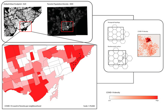 The Humanitarian Data Exchange (HDX) data for population density in Canada at a 1-km spatial resolution were extracted for the Toronto boundary. Both layers were combined and normalized within a hexagonal bin topology of 100-m hexagons. The usage of both GUF and HXD data allows for data replicability for other regions throughout the world as a high spatial resolution performance indicator, creating a density surface and thus avoiding the restrictions of the MAUP while allowing the assessment of eminent health issues [26]. This allowed for a local zonal interpolation with a significantly better performance than traditional neighborhood analysis (Figure 4).