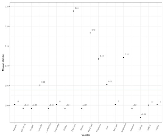 Testing for spatial autocorrelation through Moran’s I statistic provides evidence that there is significant spatial autocorrelation for COVID-19 within Toronto. Despite regional differences in the dynamics of cases, the spatial patterns of the residences of those assessed cases were found to be highly spatially autocorrelated (p < 0.01), with a Moran’s I result of 0.417. This suggested a high spatial clustering that justified further local exploration and confirmed that the cases of SARS-CoV-2 in Toronto were significantly spatially related. Further testing of global spatial autocorrelation was performed for all the variables studied (Figure 5).
