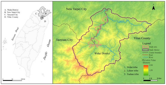 Secondary data collection was from a comprehensive review of literature using publications from scientific articles, papers, and reports after the tribes’ areas were severely damaged, and contained findings from one year of observations in the three-year Ministry of Science and Technology project “Changes of Indigenous Livelihood, Place Bonding and the Social Space Model of Subjectivity (2014–2016)” [54]. According to the disaster prevention plan data [55], recent events in the area were mainly sloping disasters caused by Typhoon Sula in 2012 and Typhoon Soudelor in 2015, each of which had accumulated rainfall of 577 mm/day and 710 mm/day, respectively. The rivers in the Wulai area subsequently soared, moving higher than the embankments and bridges and causing many roads to be cut off. Although it is found that the distribution of landslides is approximately consistent with downhill in the Wulai area, indigenous tribes are generally impacted by environmental processes both non-anthropogenically and anthropogenically at all spatial scales.