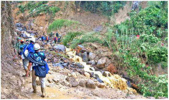 The methodological parts of this study were drawn from both primary and secondary sources. According to a comprehensive review after the tribes’ areas were severely damaged, the disaster was caused during Typhoon Soudelor, which could be put into three categories that occurred to the Wulai tribes: collapse, mudslides, and flood [56]. The collapse area mainly happened to the Lahaw and Fushan tribes; the area of the flood was mainly located near the riverside of Nanshi River, as well as the area near the Wulai tribe and the main street (business street). The road linking the Wulai tribes to the main part of the transportation system was completely washed-out, dropping precipitously to the riverbed far below. Wulai suffered the most damage by the typhoon, with landslides cutting off the district’s only road access to Taipei, as shown in Figure 3.