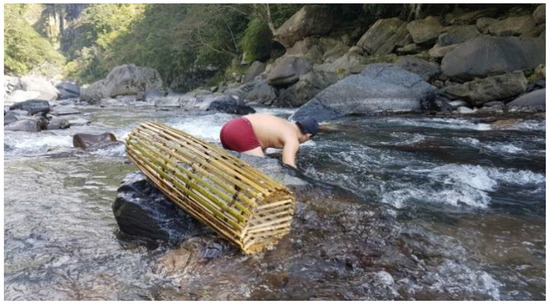 The elderly class is those who actually execute the Qutux Niqan of mutual assistance and symbiosis among the Wulai tribes. They can call for different groups to influence the internal social system as well as all attitudes and behaviors. Women’s groups, youth organizations, hunters, and the elderly exert social resilience and endogenous actions during disasters. Through the Qutux Niqan, the tribes devised of labor. Women are responsible for the meals of the tribes, and some are responsible for food distribution, cooking, washing dishes, environmental organization, etc. As noted by Respondent B: “The Qutux Niqan is our traditional culture of IK, and we often share food with our relatives, friends, and tribal members in front of our house.” Another important group is young people. During the period of providing disaster relief in Wulai, young people showed a lot of physical hard work in operating machines for rebuilding and removing soil and rocks that fell on the roads, whereas those who lived in the urban area set up supply teams to carry supplies back to the tribes on foot. Most important of all, the hunters who have IK were able to provide enough meat, fish, and other proteins by hunting to the local people (e.g., the hunter catch fish through the traditional method, as shown in Figure 4).