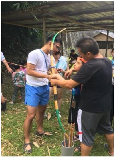 The Wulai and Fushan tribes started to promote eco-cultural tourism, including a hunter school and learning about IK inheritance to help spread the Tayal traditional life and mountain-related culture and to identify with the Tayal’s worldview and cultural spirit. Hunting culture and knowledge are the main subjects of indigenous life. The Tayal hunters’ archery and hunting skills are inherited via hunting culture and IK. They realize that indigenously co-existing with mountains and forests is the most important value to develop tourism themselves after tourism industry over-developed and the disaster. In indigenous tourism contexts, the tribal socio-cultural fabric economy could enhance the resilience to cope with disasters and crises. The local people see indigenous tourism as a strategy to inherit and continue their IK. “I taught the hunting skills to the tribal members in order to perform them for the tourists. By doing these, the young generation have the motivation to learn hunting (Respondent C)” (as shown in Figure 5). Based on this ethnic consciousness, the Tayal people have spontaneously, actively, and collectively established organizations to operate a hunter school and IK inheritance groups that regard indigenous tribes as the subject instead of the object.