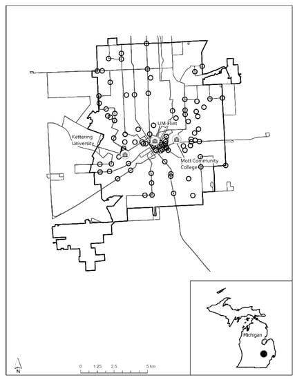 The study area in this research is the City of Flint and the primary schools of higher education residing within (Figure 1). The city is the 7th largest in Michigan and has a population of 94,867. Recently, the city has begun to be known as a “college town” due to the presence of several colleges and universities. In this research, we focused on the largest three—The University of Michigan-Flint (UM-Flint), Mott Community College (MCC), and Kettering University (KU). UM-Flint is an urban campus, has a student enrollment of 7297, and is classified as a commuter campus [,]. Mott Community College is a 2-year public institution and recent enrollment estimates are 7715 []. Like UM-Flint, the College is a commuter campus and does not provide student housing. KU is a private university with an estimated enrollment of 2315 and contains several student dormitories []. The University is well-known for its engineering program and resident student population. All of the schools have made significant strides in promoting sustainable transportation and other “green” initiatives. For instance, UM-Flint has instituted a “Go Blue, Live Green” strategy and has partnered with local stakeholders to help implement a bicycle-share program [], and, in 2013, the university was designated as a “bicycle-friendly university” by the League of American Cyclists []. KU has launched the “Generating Responsible Ecological & Environmental Neighbors (GREEN)” course cluster for all majors [] and has recently installed a bike shop and mobile bike repair-stand on campus. MCC is also focused on promoting sustainable transportation by hosting bicycle education workshops for kids [].