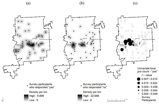 In regards to our first objective (i) in this study, an empirical analysis was implemented first to describe travel behavior trends. We then implemented two ESDA techniques to visualize the spatiality of BoB interest. First, kernel density “hot-spot” maps of each respondent’s interest (i.e., yes vs. no) in BoB were created. Kernel density maps are an established means to highlight the density of a spatial phenomenon as a raster surface. The quadratic kernel function—as described by Silverman []—was selected and implemented in GIS software to visualize the geography of BoB interest. To test this outcome statistically, we utilized a univariate join count statistic developed by Anselin et al. [] to visualize significant clustering of interested BoB responses (i.e., “yes” choices). A pseudo p-value is derived using a conditional permutation approach for those values equaling 1. The GeoDa software (version 1.14) was implemented to compute the index, and we used GIS to create the visualizations.