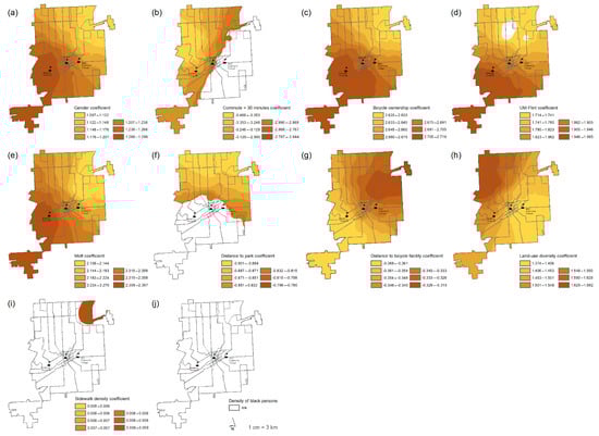 Maps showing MTA bus routes and significant (±1.96) GWLR coefficients: gender (a), commute time > 30 min. (b), bicycle ownership (c), UM-Flint affiliation (d), MCC affiliation (e), distance to park (f), distance to bicycle facility (g), land-use diversity (h), sidewalk density (i), and density of black persons (j).