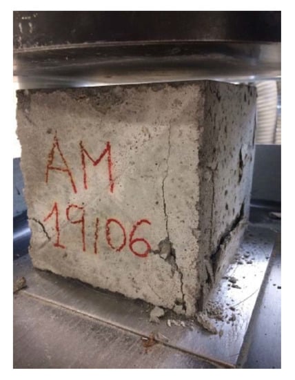 Compression strength was measured on eighteen cubic specimens with a side of 150 mm (Figure 2). The samples were tested after 3, 7, 14, 21, 28, 70, and 90 days of curing in order to evaluate the compression strength variation over time. After 28 days a significant fraction of the final resistance was obtained.