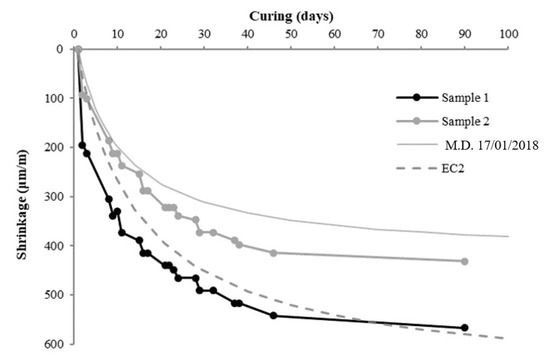 Analyzing the data obtained during 90 days of curing, the two samples reached asymptotic values of about 400 μm/m and 550 μm/m, respectively, which are typical values for a normal concrete.