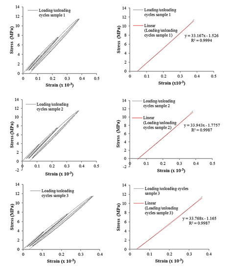 The concrete elastic modulus is directly related to the elastic modulus of the aggregates and the cement matrix. In this study, the elastic modulus was determined according to EN 12390-13 [36]. Before the test, the samples were stabilized at room temperature and humidity; conditions that were maintained throughout the duration of the test. Each sample was subjected to three increasing loading/unloading cycles, the values of the stresses applied by the press varied from F/10 to a maximum value equal to F/3, until instrumentation stabilization.