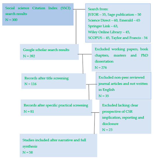 The fifth step was to review the identified literature and synthesize the results. To accomplish this review, all the authors were independently involved with the collected resources. They summarized each article in terms of related information, with CSR implications (in terms of CSR in practice, HEIs’ roles in developing the ethical, responsible, sustainable behavior of students through teaching, learning and research can be integrated [27,28,49]) and CSR disclosure (this is the combination of CSR reporting and publishing accountability as regards the society, economy and environment [24,29]). In order to conclude and synthesize the results, we exclusively focused on a year of CSR research publications, the variables employed in the research, research publications via geographical regions, the names of journals, the research methods, the sample size, critical analysis of the variable measured, the emerging issues in the prior research, and the limitations of an earlier study.